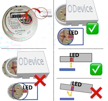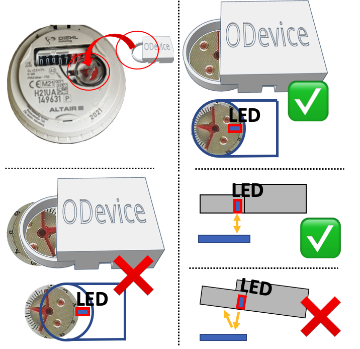 Le capteur émet une lumière qui doit se réfléchir sur le disque métallique du compteur d’eau. Il est donc essentiel qu’il soit parfaitement horizontal et bien centré sur le disque afin que la lumière émise par la LED (à travers l’orifice situé sous le capteur) soit correctement réfléchie. Tout angle ou décalage peut empêcher la détection et rendre le système inopérant.Lors de l’installation, positionnez le capteur sans trop appuyer sur l’adhésif afin de pouvoir l’ajuster si la calibration est incorrecte. Une fois la mesure validée et la qualité de calibration correcte, appuyez fermement pour finaliser le collage.