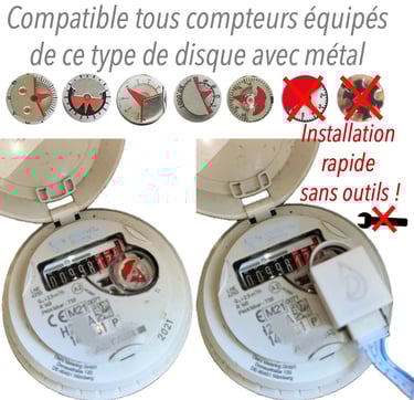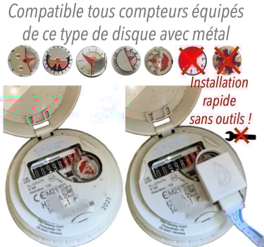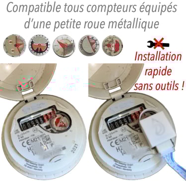 ⚠️ Important : assurez-vous que votre compteur d'eau possède une petite roue avec du métal. Elle tourne avec les litres consommés, et elle est nécessaire au capteur.