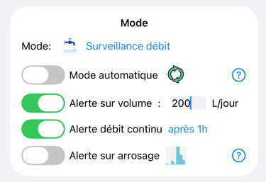 Alertes disponibles : sur volume, sur débit continue, sur arrosage