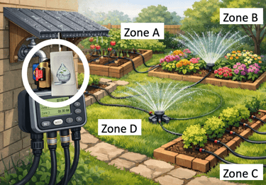 Basée sur notre solution de débitmètre ou compteur d’eau. A placer en amont du programmateur pour contrôler l’ensemble de vos zones d’arrosage.