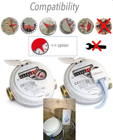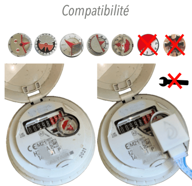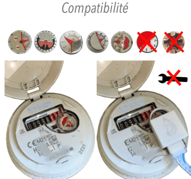 Types de compteurs compatibles (vérifiez la présence du disque métallique) : Actaisr, Honeywell, Diehl, Zenner, Sensus 1/2, Itron, Hydroconta, Schlumberger, Elste, DH, Maddalena, ...