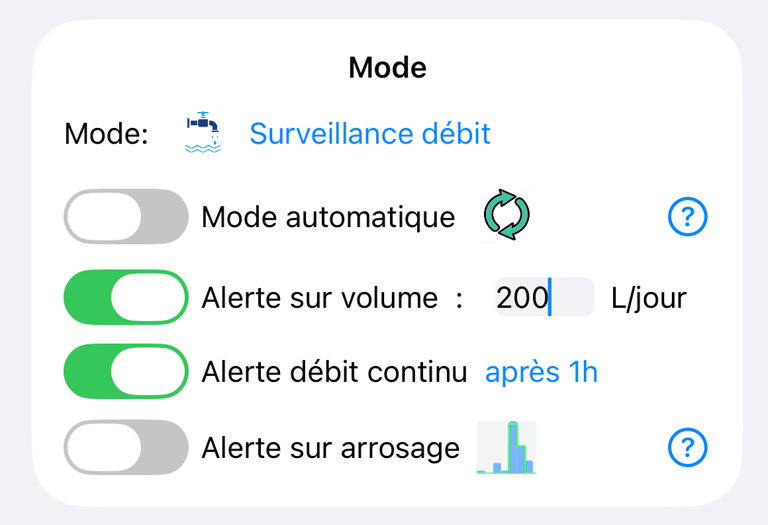 Mode précédent mais s’active en dehors des horaires de travail."Surveillance de fuites Eco"